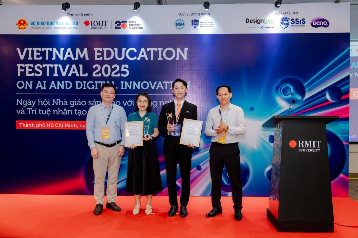 Đồng hành cùng Bộ GD&ĐT, Dự án EEAI do Tiến sĩ Trần Đức Linh và Tiến sĩ Phạm Chí Thanh (Khoa Khoa học, Kỹ thuật và Công nghệ, Đại học RMIT Việt Nam) chủ trì đã triển khai chương trình tập huấn chính thức đầu tiên về AI với quy mô toàn quốc, tiếp cận hơn 350.000 giáo viên và cán bộ quản lý giáo dục. Những kết quả đạt được từ dự án đã góp phần quan trọng đưa Việt Nam xếp thứ 5 thế giới về tỷ lệ giáo viên ứng dụng AI trong giảng dạy, theo báo cáo TALIS 2024, đồng thời giúp EEAI được vinh danh là “Sáng kiến Đổi mới giáo dục của năm” tại SEI Awards 2025.