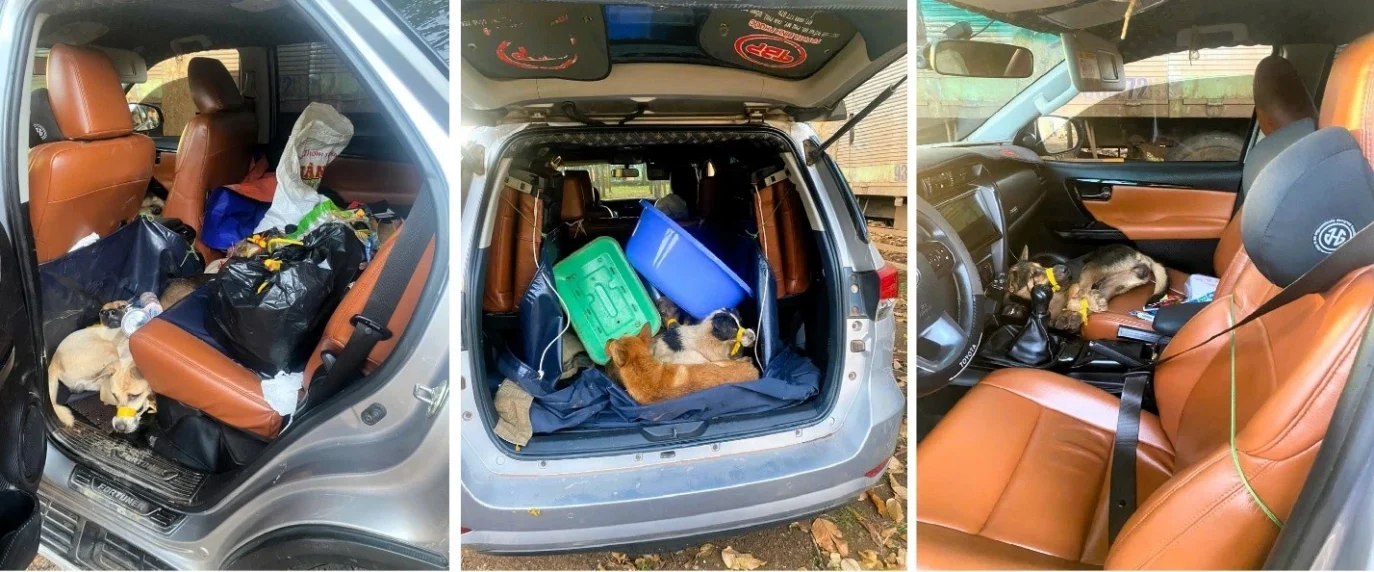 Xe ô tô của nhóm trộm chó và tang vật công an thu giữ