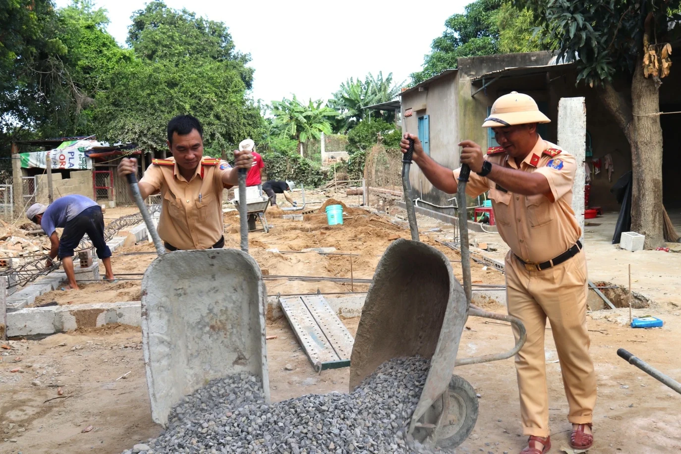 Cán bộ chiến sĩ CSGT Công an Lâm Đồng giúp công sức xây nhà mới cho gia đình anh Nguyễn Ngọc Vương ở ven sông Cái